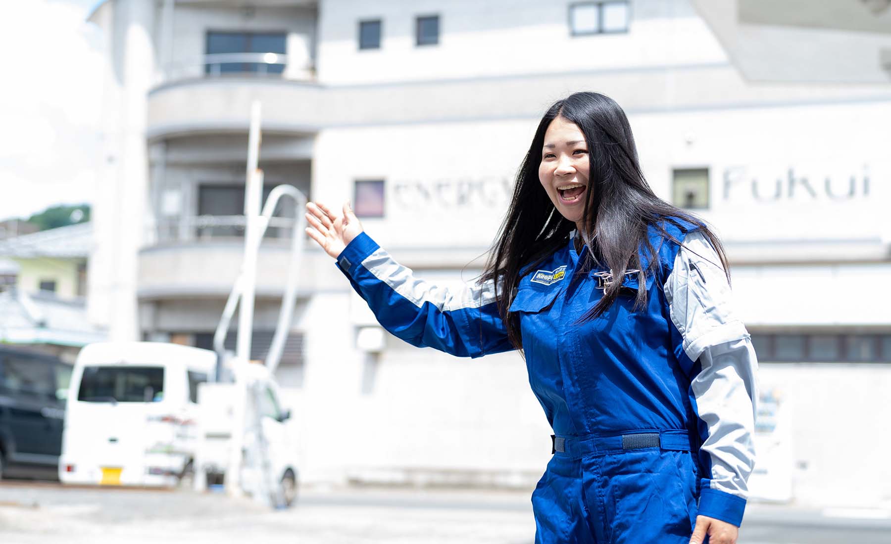 東舞鶴SSで接客や給油、洗車、オイル交換などを担当しています。子育てをしながら働ける環境を探していた中で出会い、アルバイトから社員へ。若いスタッフも多く、明るく活気のある職場です。コーティング作業でお客様に喜んでもらえた時は大きなやりがいを感じます。