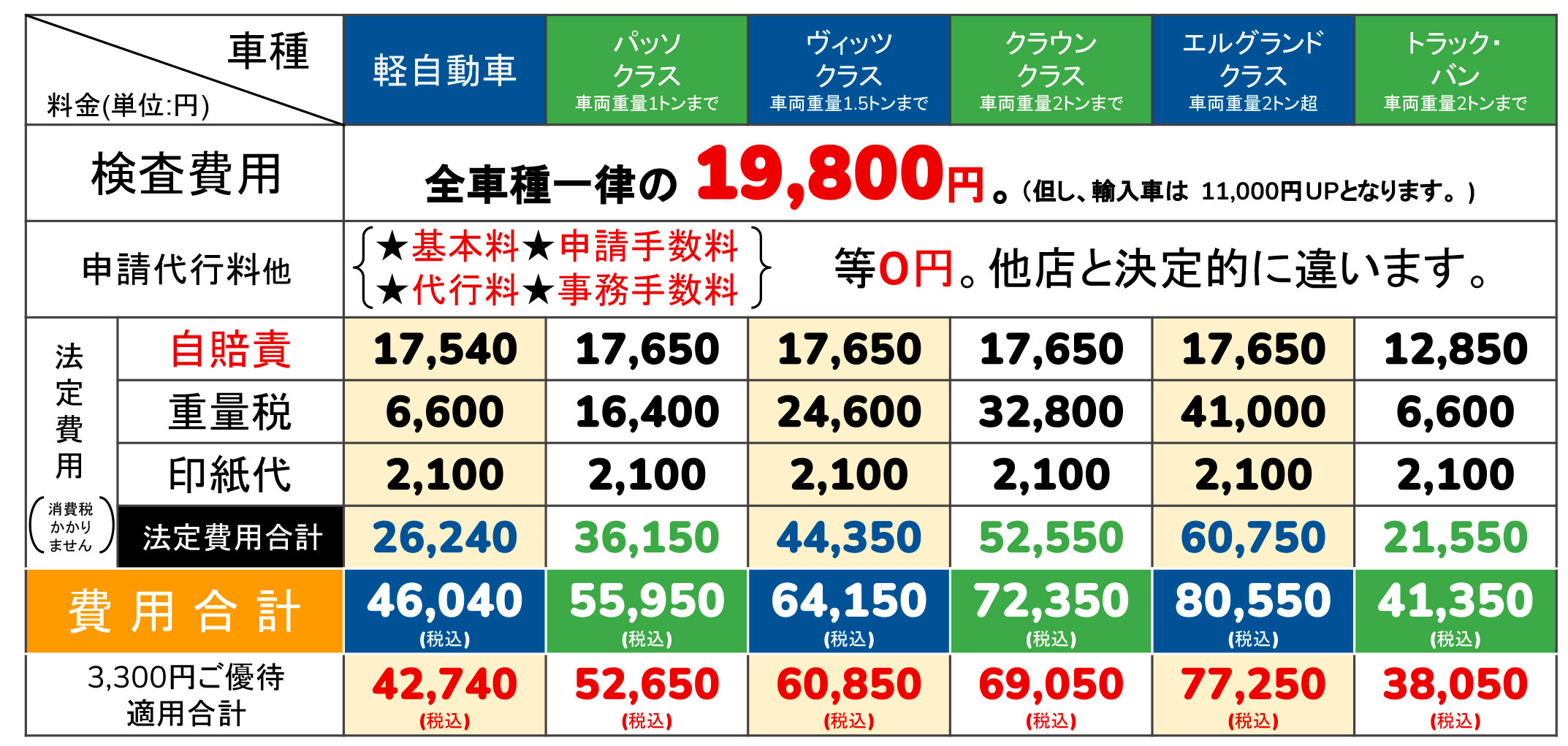 - 上記金額には、法定56項目の点検費用が含まれております。※輸入車は10,000円+消費税アップとなります。